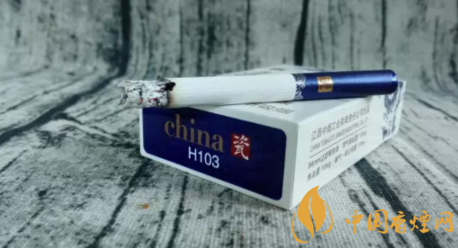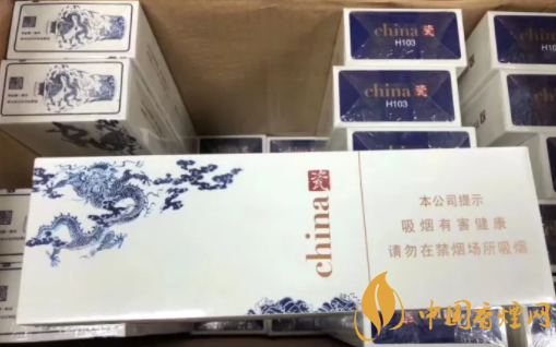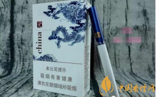 烟盒正面主图为青花腾龙造型,张牙舞爪,欲入深海而搅起惊涛骇浪。烟盒顶端,印有青花瓷瓶的图案,同时加以文字简介。烟盒底端主色调为深蓝,与正反两面的蓝色青花龙色调相辅相成。China和瓷的品名,再次印制于此部位。H103,是指产品的随机编号。
