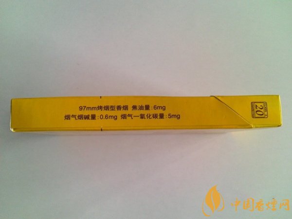 右侧为详细的商品信息,97mm烤烟型香烟,三项理化指标相对均衡:焦油量6mg 烟气烟碱量0.6mg 烟气一氧化碳量5mg。