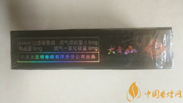 烟盒右侧标注着香烟的理化数值,标注着过滤嘴香烟长84mm,0.8mg烟气烟碱量,8mg焦油量,8mg烟气一氧化碳量,印有主品牌单位和“云烟”的字样。