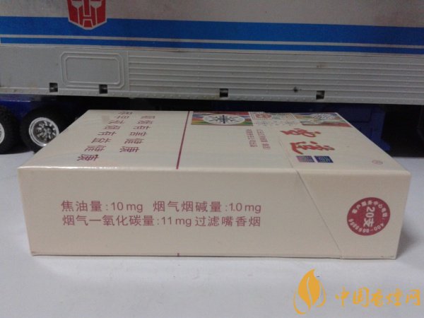 右侧理化指标标注非常清楚,焦油量为10mg,烟碱量为1mg,一氧化碳量为11mg。烟盒金色内衬纸纹路非常细腻,让人看着非常的舒服。