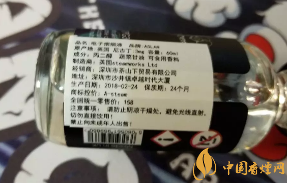 外包装比较简单黑色的背景上是烟油的名字,油瓶为60毫升玻璃滴管瓶,尼古丁含量为3毫克,烟油比例为30/70。