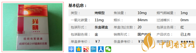 三、光明金世纪香烟参数光明金世纪香烟焦油量:15mg 烟碱量:1.3mg 这烟本地没有,估计是停产烟。不过从朋友里了解过这款烟草。“光明”牌香烟整体设计的风格是以火炬为主题,设计简捷明快,给人以美感与冲劲。拥有火炬者等于拥有光明,永远向上的雄心壮志,具有丰富的文化蕴味和情感内涵。