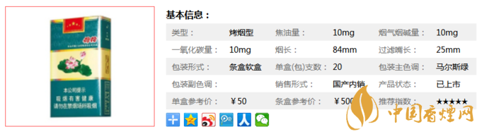三、钻石软荷花参数在原有手工选叶、音乐韵化、能量水活化的基础上,钻石(软荷花)运用小配方技术与计算机配伍相结合的方式,针对不同烟叶特性,对专属原料进行精心筛选、科学配伍,使叶组配方协调一致。下面我们一起来看看它的参数信息:烟长84mm,焦油量10mg,烟碱量10mg,一氧化碳量10mg。