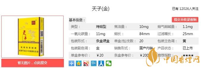 天子金烟支长85mm,过滤嘴长25mm,选用优质进口凹槽嘴棒,采用滤嘴通风技术,有效降低了烟气中有害物质的含量,顺应了目前降焦减害的发展方向。下面我们一起来看天子金的参数信息:焦油量:10mg 烟碱量:1.1mg 一氧化碳量:11mg