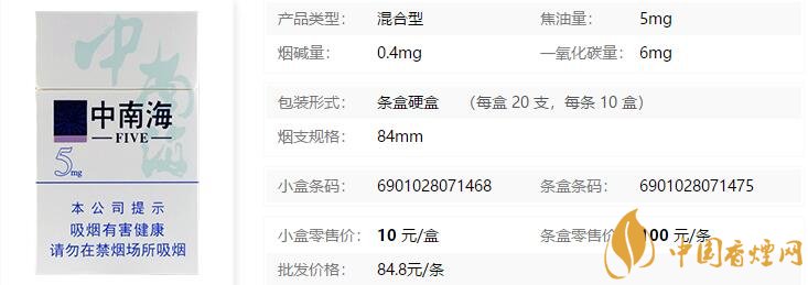 中南海(5mg)俗称点五,是中南海中的经典款。价格是相当的亲民。是领先世界水平的新一代低危害卷烟产品。经香草通小编市场调查中南海(5mg)售价为10元/包。