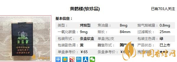 黄鹤楼(软珍品)号称是湖北软中华,先是只外销后才转为内销的。在60元档烤烟市场与芙蓉王的软蓝、云烟棕印象号称三杰。与霸主软中华可以一较高下。经烟吧小编市场调查黄鹤楼(软珍品)售价为65元/包。