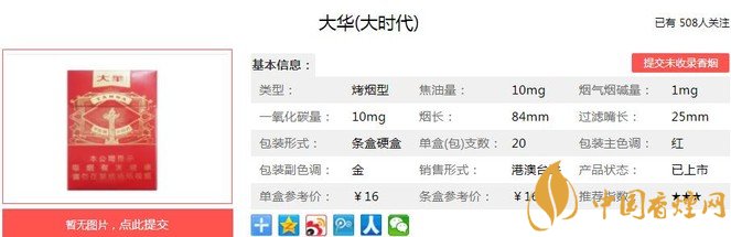 台湾制造,取材自然,配方考究,工艺精湛,原料甄选自南纬23° 以北和北纬23°以南世界级优质名产区出产的优质烤烟烟叶,烟气醇和饱满,烟香细腻丰富,口感纯正,三香合一。经烟吧小编市场调查大华大时代售价为16元/包。