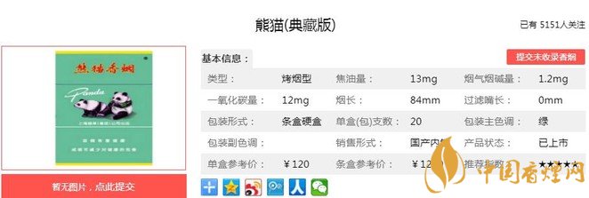 熊猫(典藏版)烟支长84mm,过滤嘴长30mm,金色“熊猫”、蓝色“Panda”的字样印在横纹卷烟纸上,导致烟条段的视觉效果很短。烟丝为纯叶丝,无填料,金黄油润,柔软整齐,品质上乘。下面我们一起来看熊猫(典藏版)的参数信息:焦油量:13mg 烟碱量:1.2mg 一氧化碳量:12mg