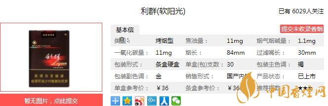 为了保证卷烟的香味品质,通过对所有仓储烟叶中的高档原料进行分析化验和内在品质评定,选择国内外香气足、烟碱适中、焦油含量低的优质烟叶,精心配比,在化学成份比例协调的基础上,保证其突出的香气风格和特征。经测定,焦油和尼古丁的比值保持在10∶1左右的合理范围,且焦油量进一步降低,烟气更加柔和细腻。经烟吧小编市场调查利群软阳光售价为36元/包。