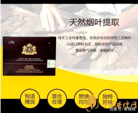 口感:全叶卷片烟纯手工雪茄;香气纯正、丰满,吸味顺爽。微微的辛辣感,以烟叶原味为主线,融合交错,劲头适中,味道均衡。不冲不淡,十分适合初尝雪茄的雪茄客。