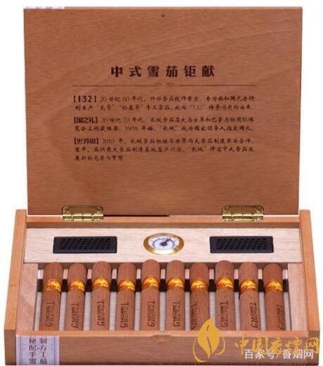 长城雪茄是中国历史最悠久的一个品牌。长城(10支132秘制)是纯手工的制作加上独特工艺配方,全球首创的预开口雪茄,不需要剪去茄帽,原木色木盒十支装,简约、精致。每支都是全手工完成,盒中还有保湿器和温度计。湿度恒定在68%左右。刻度盘下面有NORMAL字样,示意60%-80%的湿度为正常范围。这里的用心之处可见一斑。