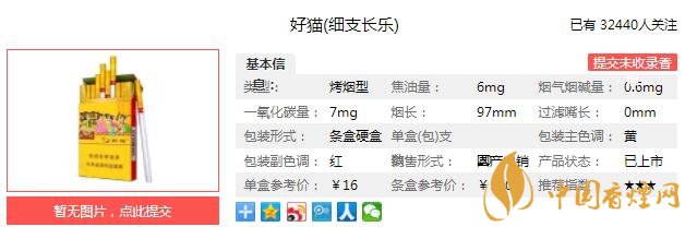 好猫细支长乐烟支长97mm,烟嘴明黄色,白色的图案装饰,古朴的竖匾印有副品名称,比较雅致,红色的条带环绕一周,印有“好猫”品牌名称。烟丝充填比较松软,色泽金黄油润。下面我们一起来看好猫细支长乐的参数信息:焦油量:6mg 烟碱量:0.6mg 一氧化碳量:7mg
