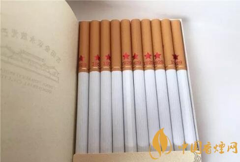 侧开式烟盒设计,烟盒盖内部是红色并印着金色五角星和1929,烟支被一张很具有复古色彩的纸张覆盖着,上面有八个大字“古田会议永放光芒”,给人一种看党章的感觉,设计简约而不简单。经烟吧小编市场调查古田金中支售价为50元/包。
