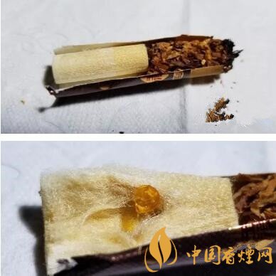 剖开滤嘴,是经典的一段式醋酸纤维丝束。降焦孔开在了前1/3段,从丝束的颜色变化来看,前段微黄,后段稍浅,颜色变化均匀。也没有从降焦孔向后的条带,应是烟气流速稍慢,空气混合充分的结果。剖开丝束,可见橙色的爆珠。