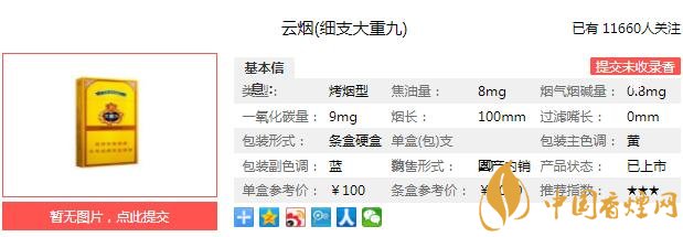 一、云烟(细支大重九)香烟价格