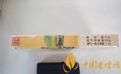 烟盒的左侧连贯着图案,下面是这款烟的理化指标:焦油量:8mg、烟气烟碱量:0.8mg、烟气一氧化碳量:7mg等,在左侧上方还有类似印章一样的正方形红色字体,标明内有贰拾支装。