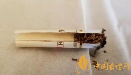 剖开滤嘴,为一段式的醋酸纤维丝束。没有开降焦孔,丝束颜色浅黄,如此填充紧实的烟支,很不错!丝束上有条带状色深带,是竖纹盘纸导气所致。