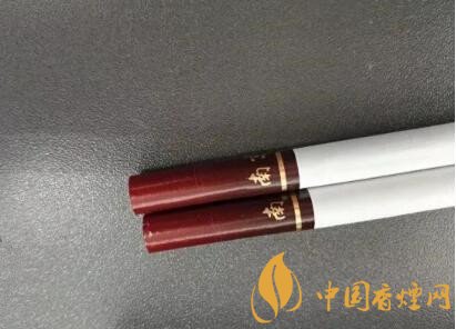 从盒子里面抽出两支烟来,放置于桌上,观之,烟嘴的颜色和烟盒的颜色也是一样,采用了渐变色,红褐色的烟嘴中间有两排不怎么明显的降焦孔。烟嘴的长度为32毫米,而整个烟支的长度还是普通的84毫米。烟嘴下部有南京二字和印有古都两个字的印章图案。一道闪闪发光的金箍环绕着整个烟嘴。