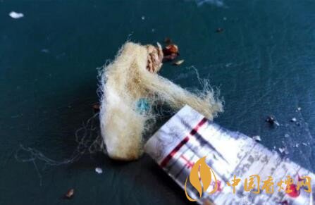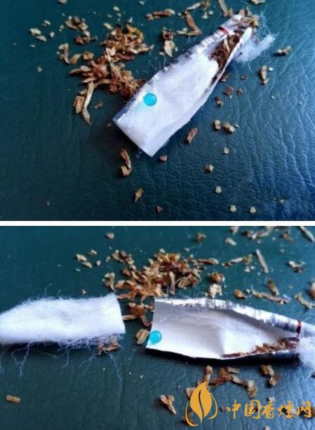 下面两张图片,是过滤嘴中内置爆珠剪开后的构造。爆珠的颜色为蓝色,里面的海绵是一段完整未分离的样式。