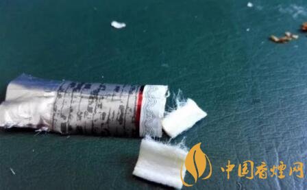 剪开镂空样式的过滤嘴,会发现有一层薄薄的黄色纸张,附着于过滤嘴纸张之上。镂空过滤嘴的长度,约为6mm。