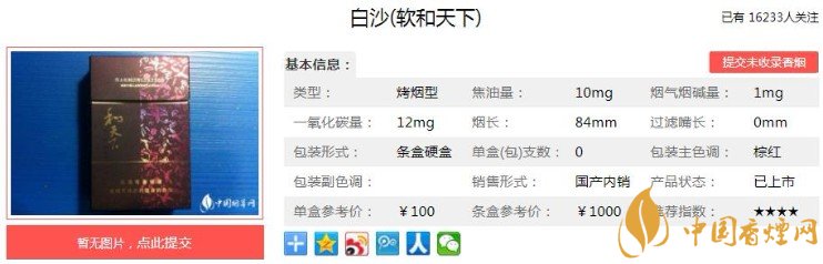“白沙(软和天下)在吸味、香气与刺激性上的协调完美;烟嘴仍然采用了圆形镂空烟嘴,长度37mm,样式与硬和也是基本一样,只是多出来一道金环。基本参数如下:焦油量:10mg