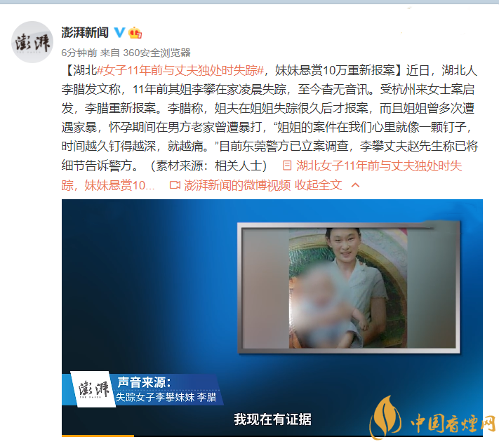 湖北女子11年前与丈夫独处时失踪,妹妹悬赏10万重新报案