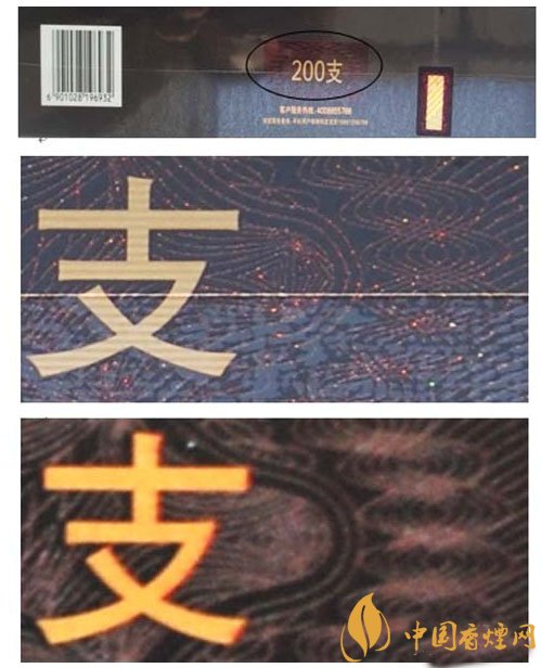 真烟采用超细线防伪,线条交叉处条纹清晰,不粘连;假烟超细线处印刷粗糙,交叉处粘连、模糊。