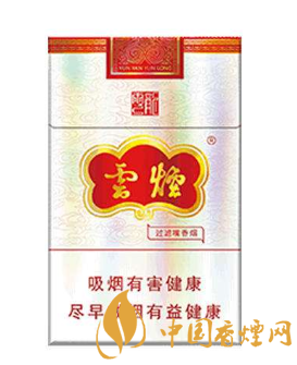 4、云烟(云龙),价格:16元/包。 84mm超细支的云龙,在烟包正面上,依旧沿用令人过目不忘的logo,“云龙”二字的繁体方方正正,给人以一种中规中矩的视觉感受。翻盖上的假印花让人第一印象,这是一包软包香烟,其实只是点缀一下烟标的设计,走品牌复古的路线。