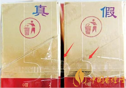 真烟的黄楼楼图案,印刷精美、套色均匀,尤其是黄鹤楼图案两侧的飞鹤翅膀边缘棱角分明,线条较细;而假烟的印刷工艺要粗糙的多,套色不均匀。相较于真烟,假烟黄鹤楼图案没有光泽,而且飞鹤的翅膀边缘棱角不明显。