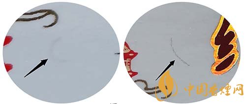 假冒卷烟:该款假冒卷烟彩色纤维丝清晰,纤维丝印刷在商标纸表面。图4左真右假