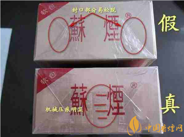 第三看拉带处,真品苏烟拉带处有不规则的点状胶痕,假烟则没有胶痕,且容易脱落。