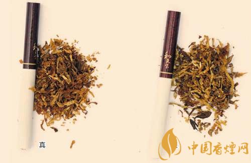 真烟烟支采用复合滤嘴,烟丝切丝宽度均匀,烟丝疏松、光泽油润性好、呈柠檬黄色,烟丝结构为叶丝和少量膨胀梗丝;假烟烟支采用普通滤嘴,制丝工艺简单,烟丝宽度不均匀,有少量梗丝,未经过膨胀处理。