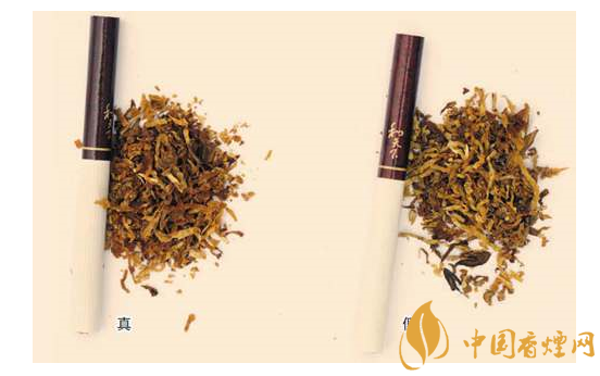 四、烟支过滤嘴及烟丝差异对比:真烟烟支采用复合滤嘴,烟丝切丝宽度均匀,烟丝疏松、光泽油润性好、呈柠檬黄色,烟丝结构为叶丝和少量膨胀梗丝;假烟烟支采用普通滤嘴,制丝工艺简单,烟丝宽度不均匀,有少量梗丝,未经过膨胀处理。