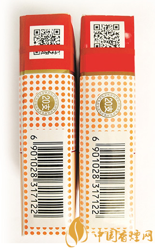 真烟商标纸色泽鲜艳,二维码位置较低,“20支”字样位置稍高。假烟商标纸色泽浅淡,二位码位置较高,“20支”字样位置稍低。