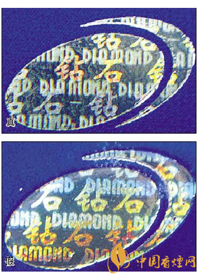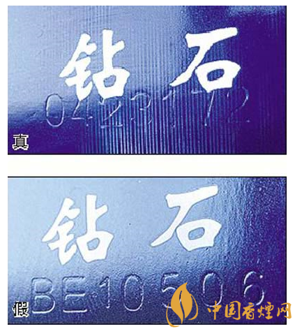 五看钻石图案:真烟钻石图案印刷清晰,色彩感强,内有微缩英文字母“DIAMOND”,图案无凹凸感;假烟印刷不清晰,用手摸上去有凹凸感。