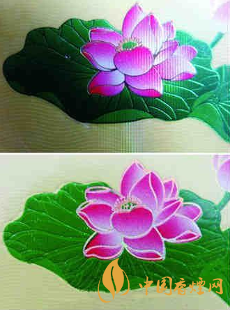 4.看小盒正面荷花logo图案,真品钻石荷花,该处是采用凹凸烫金技术印刷,“荷花”图样立体感明显,尤其是花蕊位置清晰;而假烟是采用高清照相扫描进行仿制,logo图案套色、烫金不准确,花蕊位置模糊。