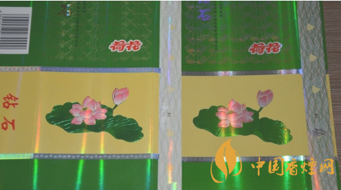 正面假烟的黄色背景发案荷花纹路粗糙,荷花俩字发暗红不够鲜亮,荷花的金丝不够明亮,