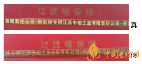 看小盒拉带。真品“南京”(红)拉带上字体清晰,光泽鲜艳,字体里有许多细小的水平纹路。假烟笔画较粗,光泽暗淡。