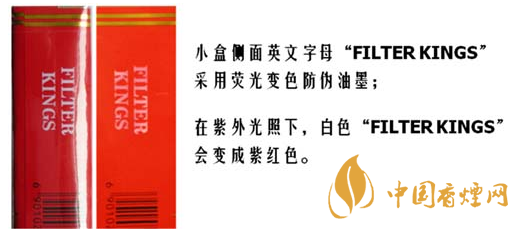 2.小盒:光变防伪涂层——小包侧面“FILTER KINGS”字样,经阳光直射或紫外光照射后由白色变成紫红色,停止照射后,紫红色会逐渐消退。