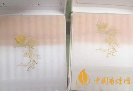 小盒商标印刷工艺差异对比:真品小盒正面套印定位烫金“飞龙”图案鳞片清晰,从头至尾都能看到定位烫金工艺,红色贯穿整个龙身,“鳞片”是雪里透红,栩栩如生;假烟套印定位烫金仿制较差,鳞片无法达到真品的印刷工艺水平,印刷工艺与真品商标图案差异明显。
