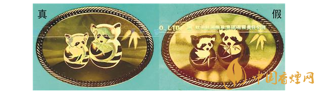 镭射防伪标识差异对比:真烟镭射防伪标识清晰、无漏色,竹叶叶片清晰光滑无条纹,两只小熊猫身上和头顶的毛粗细均匀;假烟镭射标识粗糙模糊,竹叶叶片有条纹状,两只小熊猫有漏色,身上和头顶的毛粗糙不均匀。