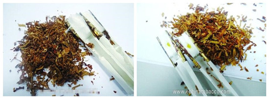 真品滤棒中添加了“香润珠”,油润性好切丝均匀,颜色呈现金黄色;假烟滤棒未添加“香润珠”,烟丝干直切丝粗细不一,颜色呈现出浅褐色,与真品存在显著差异。