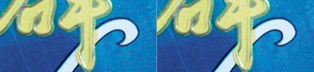 3.看小盒商标印刷细节,真烟的印刷方式为凹印、胶印相结合,“群”字下方黄色笔划部分边缘呈锯齿状,而黑色笔划边缘则是光滑的;而假烟则是采用胶印方式印刷,字体笔划边缘都是光滑的。