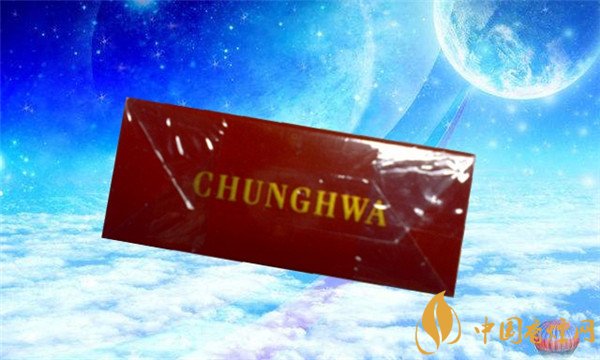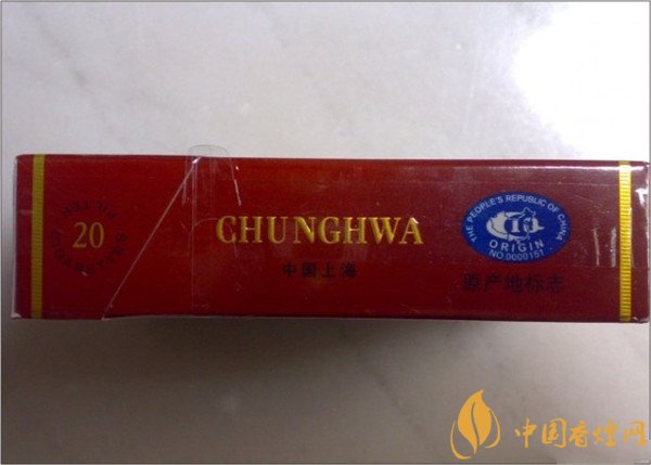 烟盒的左侧标注着英文字母“CHUNG HWA”和蓝色的防伪标签。中华的出产方。