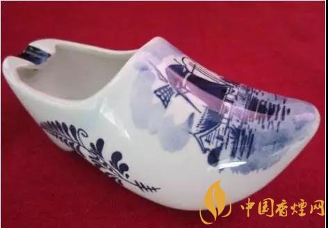 这款工艺烟灰缸是来自荷兰的这款烟灰缸,呈尖头木屐形,底色为白色,除少量文字与边纹外,图案皆以蓝色绘之。这款高档烟灰缸图片鞋身左右前后都绘有对称的三叶草图案;鞋面绘有荷兰风车、村舍及水田灌木图案;此外,鞋头还用淡色绘以蓝天白云,笼罩上空。而鞋口靠近鞋跟方向的边沿处,设计了三个凹槽,方便多人吸烟时使用。总而言之,是一款颜值与实用并存的烟灰缸无疑了。