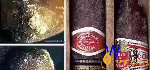 3、雪茄发霉了:这个大伙务必看清楚的,茄烟灰白点是什么?是绿色的毛毛。保存雪茄如果出现霉点,那就说明这个雪茄柜湿度太大了。其实你也不用慌张,先把发霉的雪茄拿出来,避免传给其它的雪茄。
