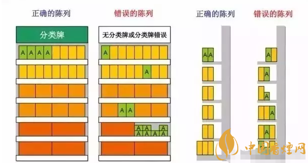 卷烟商品在柜台、货架上的陈列按照地域、品类、价格、包装颜色等因素有规律的摆放,做到分类明确,重点突出,主次分明,井然有序,为消费者节省时间,方便消费者选购。