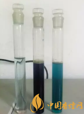 左二黑色瓶为收集烟气后情况(浓度太高,超出仪器读数范围) 左三蓝色瓶为经过加水稀释后做实验的样品。