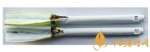 三、烟支过滤嘴及卷烟纸差异对比真烟过滤嘴中的绿色香线较细,颜色也较淡,卷烟纸上线条呈网格状;假烟过滤嘴中的绿色香线较粗,颜色也较深,卷烟纸上线条为横螺纹。
