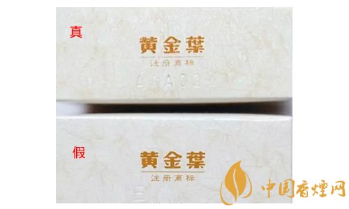 真品商标纸采用胶印印刷,“黄金葉”字体采用压凸烫金工艺,字体笔画饱满清晰且较粗,“葉”字中草字头与下面不粘连;假烟采用高清扫描仿制印刷,“黄金葉”字体笔画较细且边缘较粗糙,“葉”字中草字头与下面有粘连,与真品特征存在明显差异。